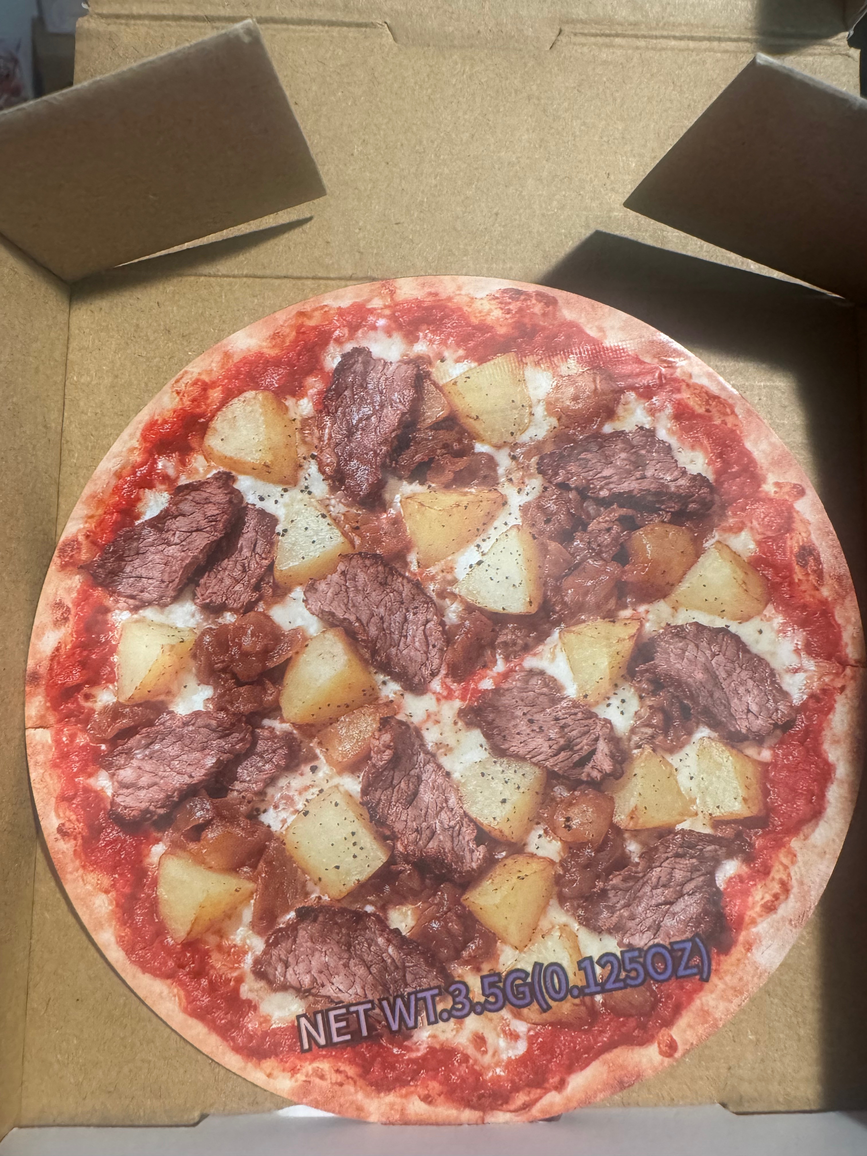 Comes with 3.5 8th pizza box and pizza mylar bags. Exotic white ash. 4 different pizza mylars strain change but are at same price point and quality.